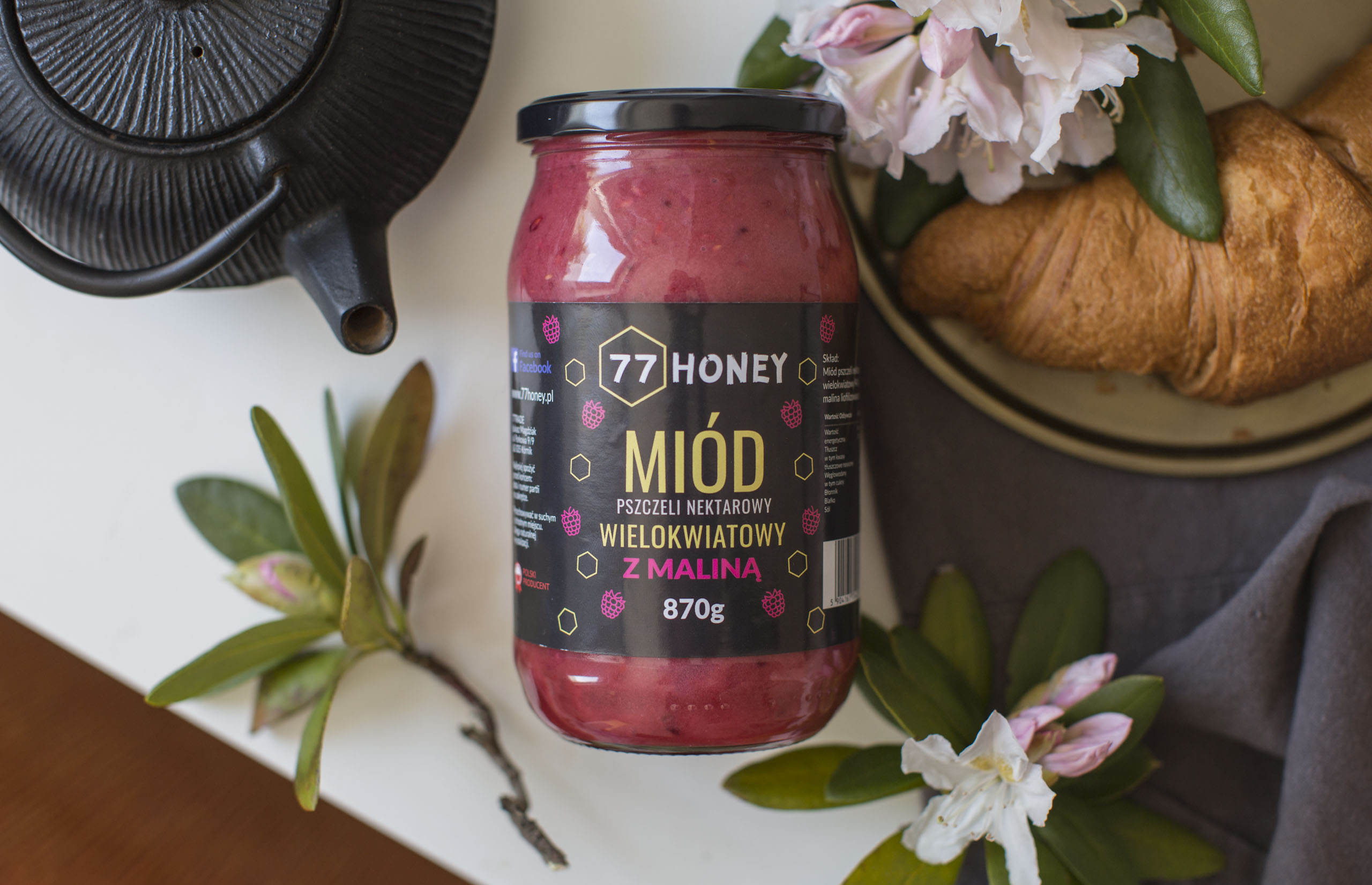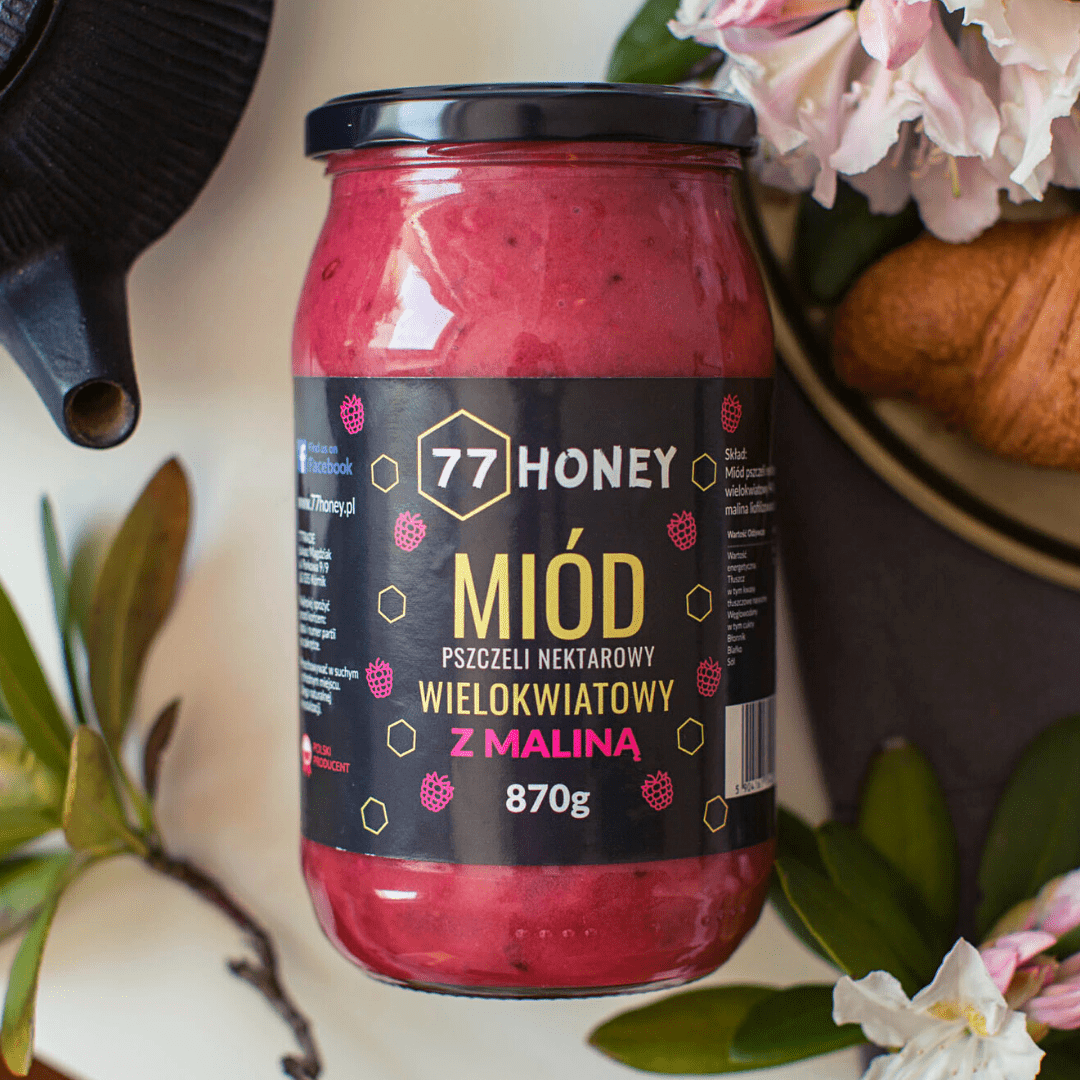 🍯 Miód z dodatkiem malin to połączenie miodu wielokwiatowego z owocami maliny. Dzięki procesowi kremowania miód ma delikatną i puszystą konsystencję.