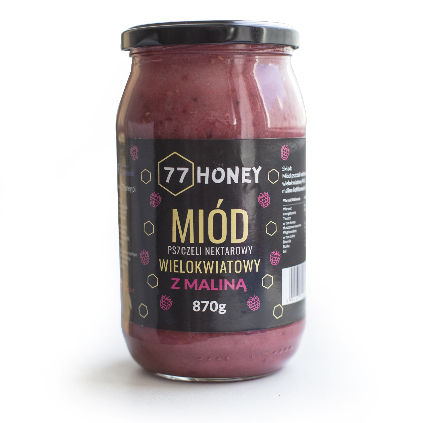 Składniki: miód wielokwiatowy 94%, malina liofilizowana 6%. Produkt pochodzi z Polski.